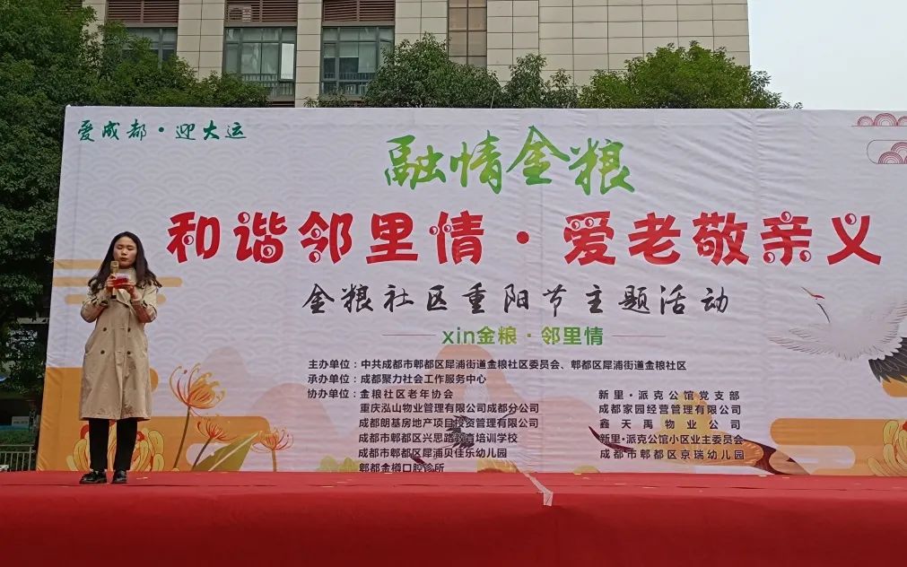 首先犀浦街道工会主席周长江、犀浦街道金粮社区党委书记曾小英在开场舞后为本次活动致辞,共同为社区老年朋友送上了节日的祝福,对关心社区老年人生活的各界人士表达了感谢,并对新金粮的发展提出了美好的愿景。