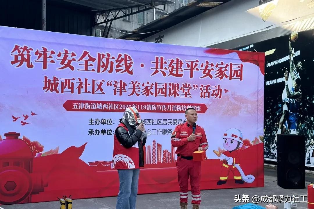 11月27日上午10点,成都市新津区五津街道城西社区“津美家园课堂”——消防培训演练活动在金三角V街区火热开展。本次活动由城西社区居委会主办、成都聚力社会工作服务中心承办,以“普及知识、强化技能、自治共建、筑牢防线”为宗旨,特别邀请新就业群体、居民代表、电动车商家及社区微网格员共同参与,通过“案例警示+知识讲解+实战演练”模式,送上实用消防安全“必修课”。